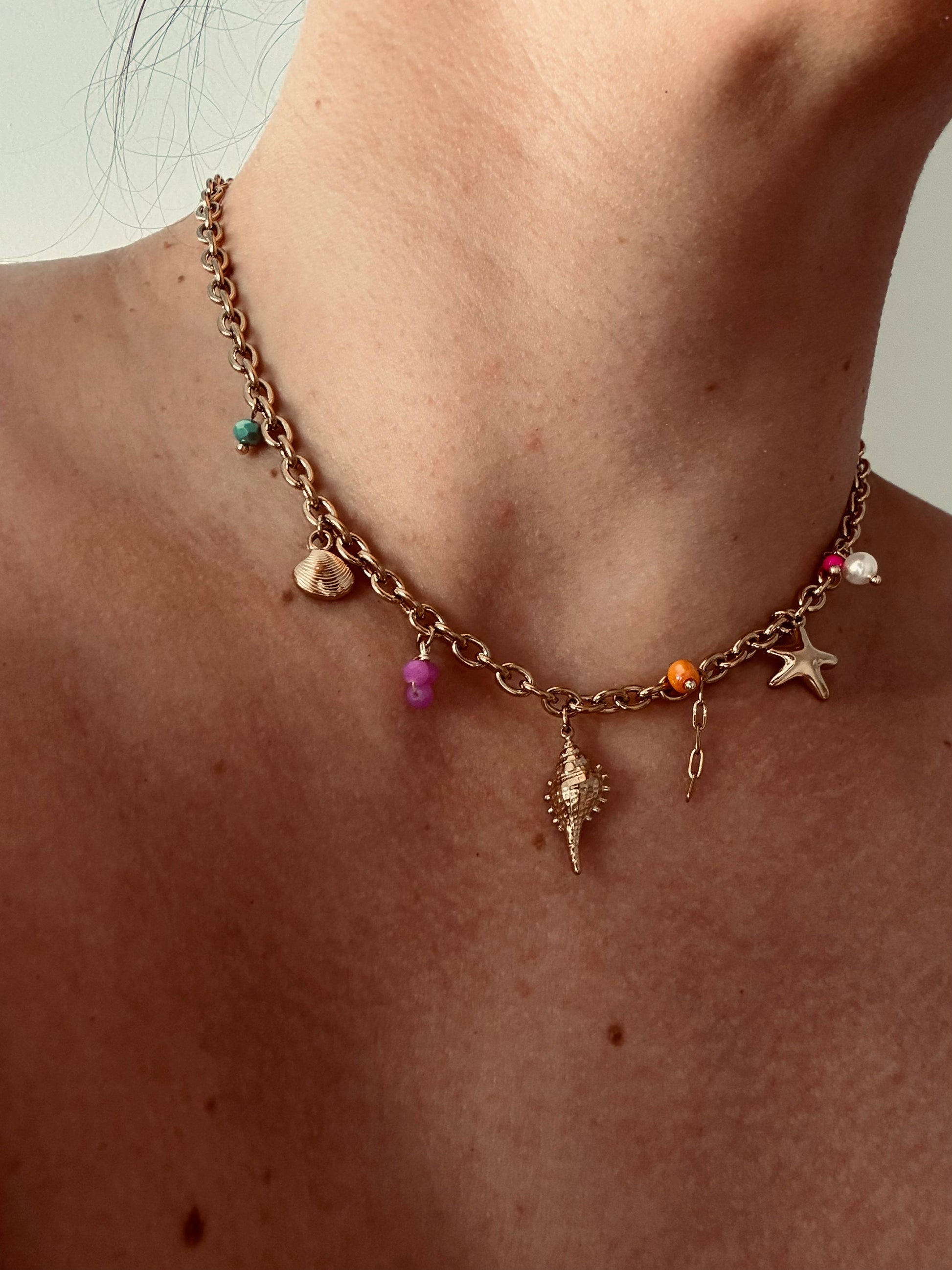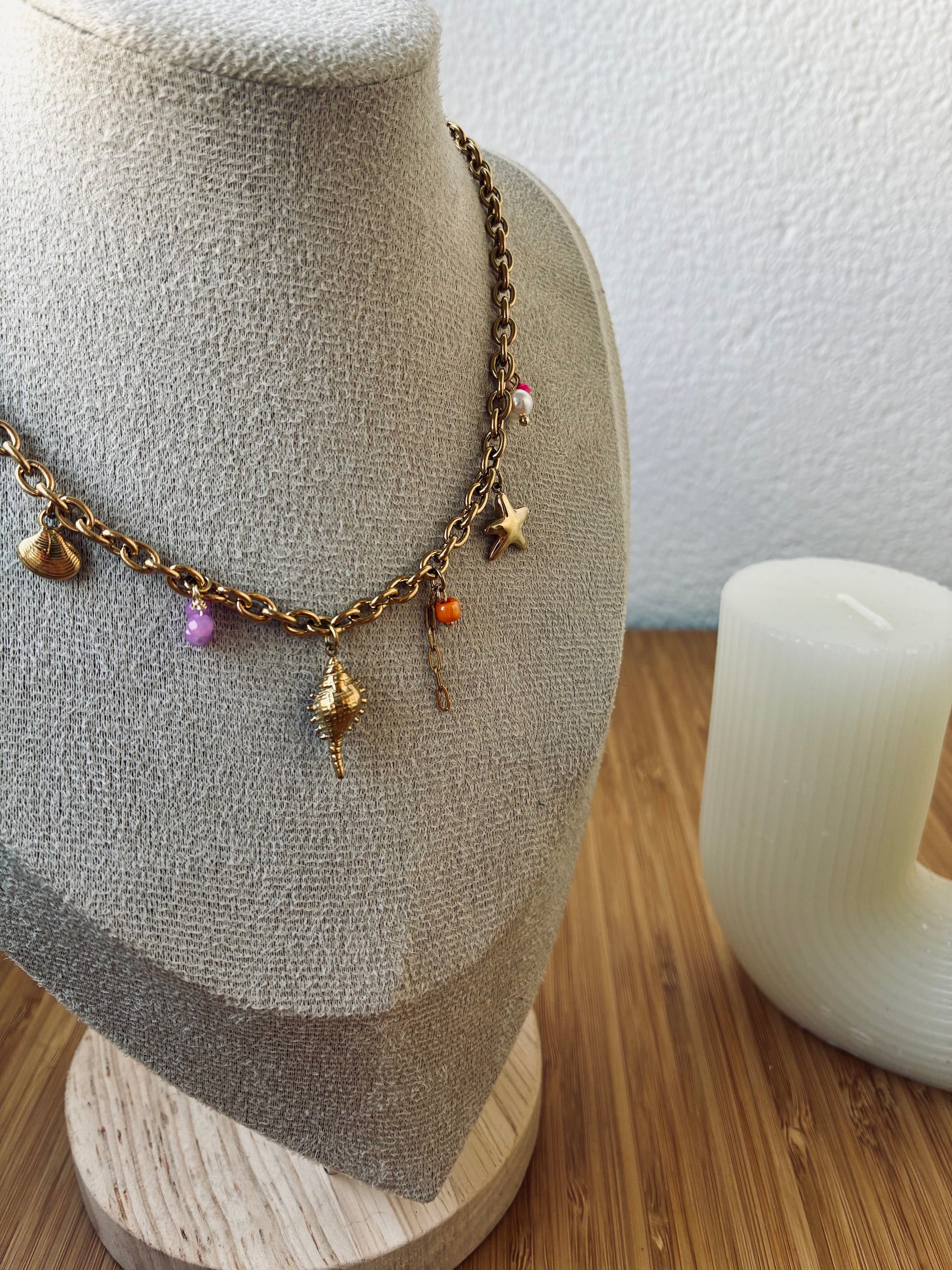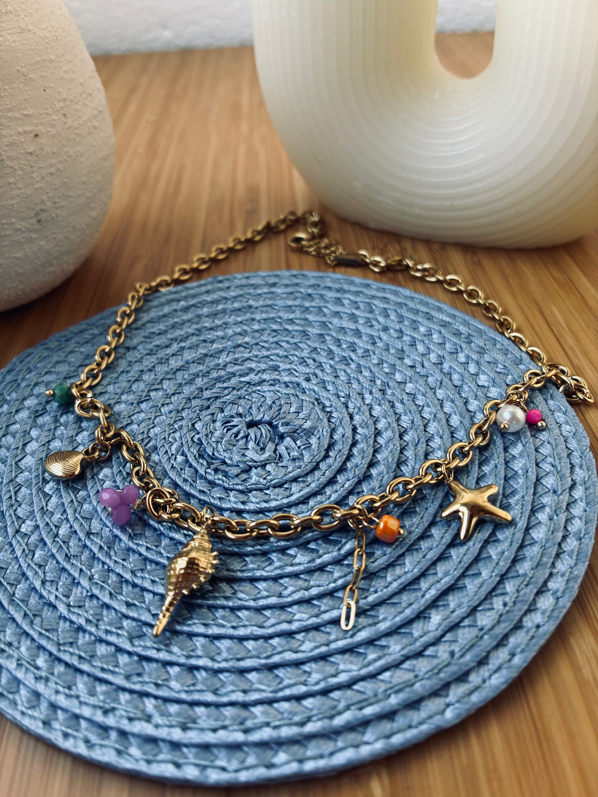 Corrente em aço inoxidável com pendentes de missangas coloridas e aço inoxidável.