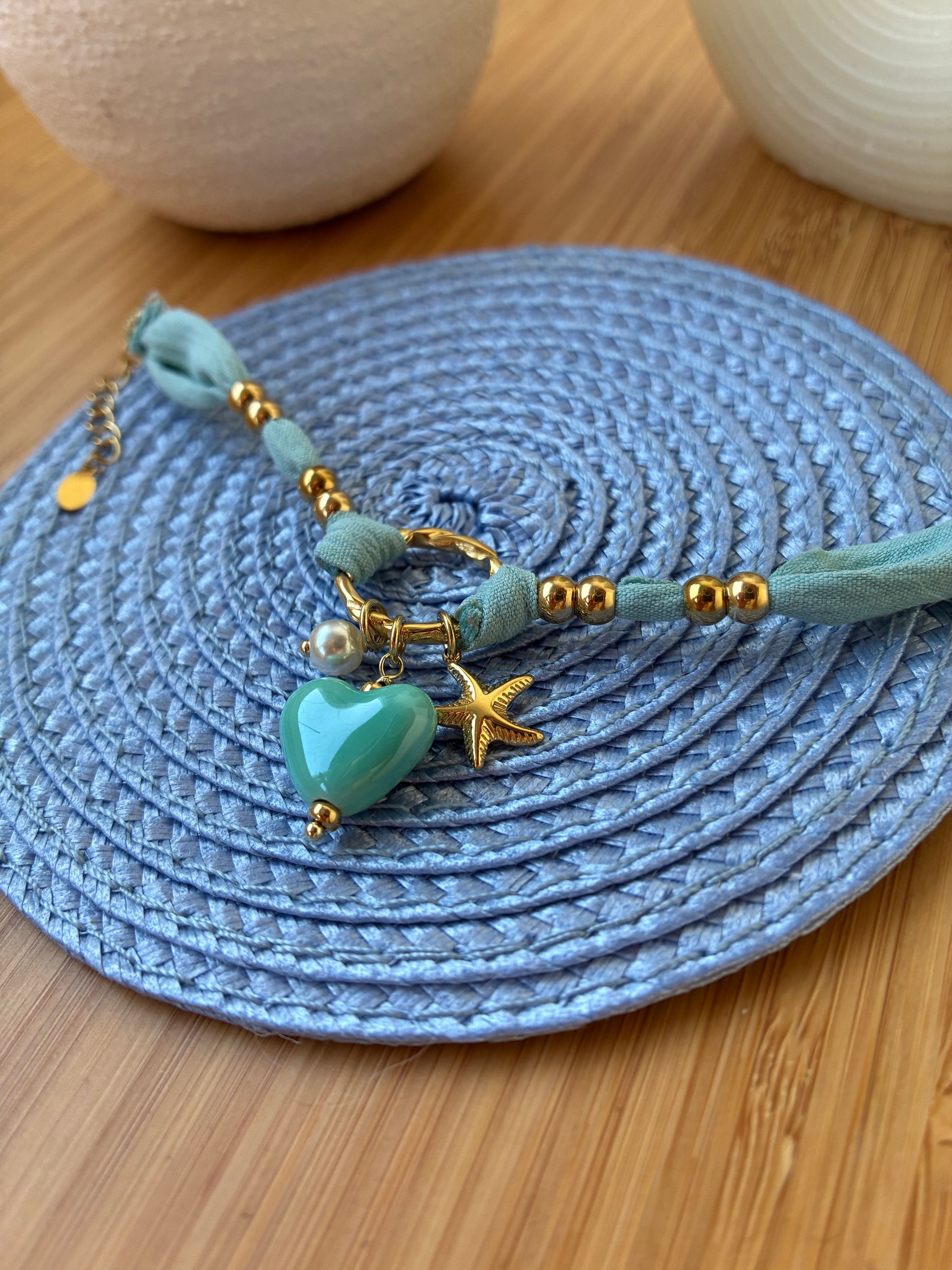 Pulseira em tecido, com detalhes e pendentes em aço inoxidável e cerâmica